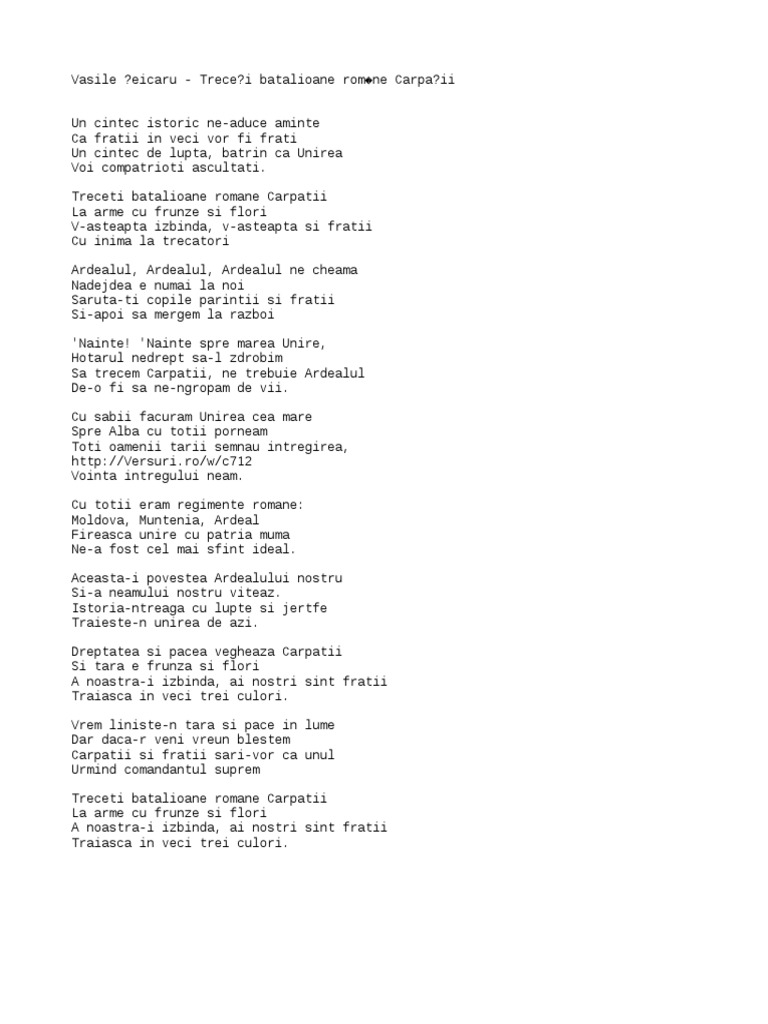 ?i fra?ii cu inima la trec?tor. It is thought to have been composed in 1916. Treceţi batalioane române carpaţii, длина: Treceti batalioane romane carpatii — румынская песня. (trece batalioane carpa muzica reprezentativ armatei).