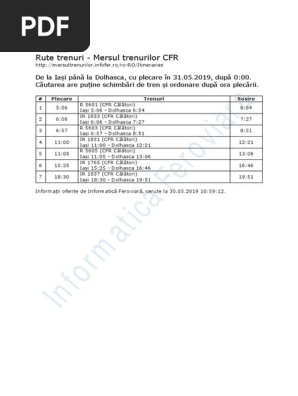 Trenul 1861 constanta iasi vezi serviciile pe care le ofera trenul, km parcursi, ora de plecare din constanta si ora de sosire iasi, statiile prin care opreste trenul 1861. 0 ratings0% found this document useful (0 votes). Căutați rapid rute cu trenul în românia între cele aproape 2000 de stații ale rețelei cfr.